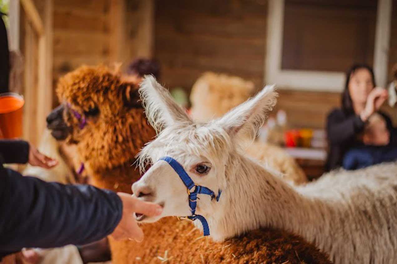 - Bezpieczna, specjalnie przygotowana przestrzeń, gdzie można podejść do alpak, pogłaskać je, nakarmić i spokojnie poobserwować z bliska.