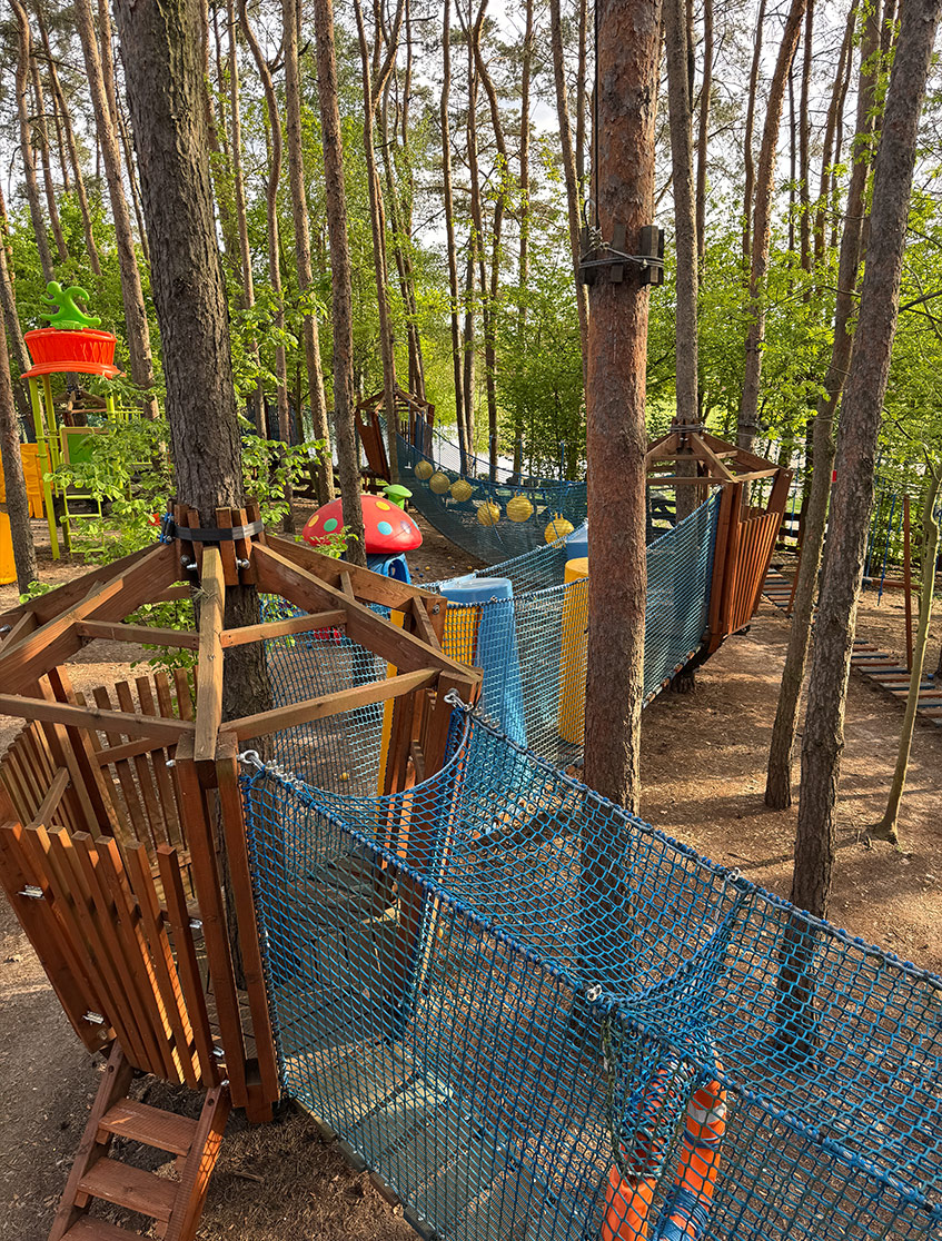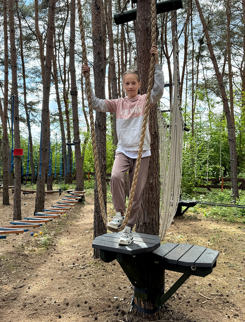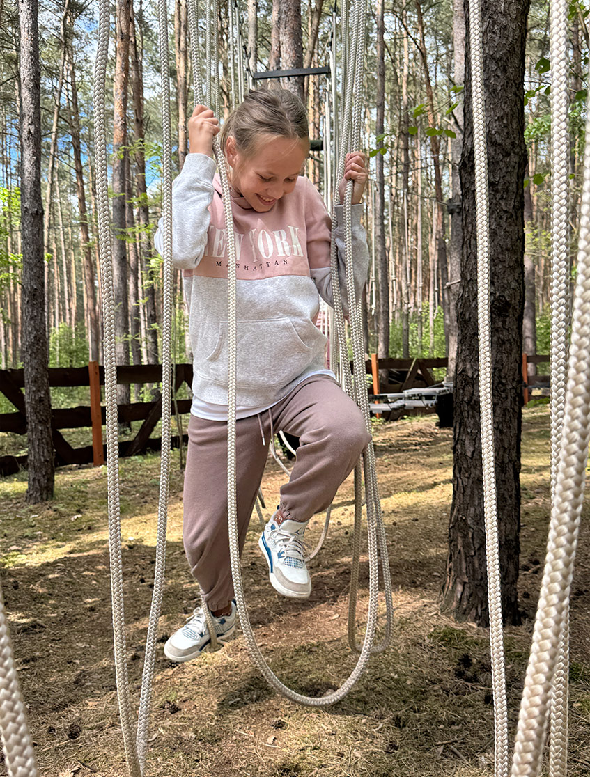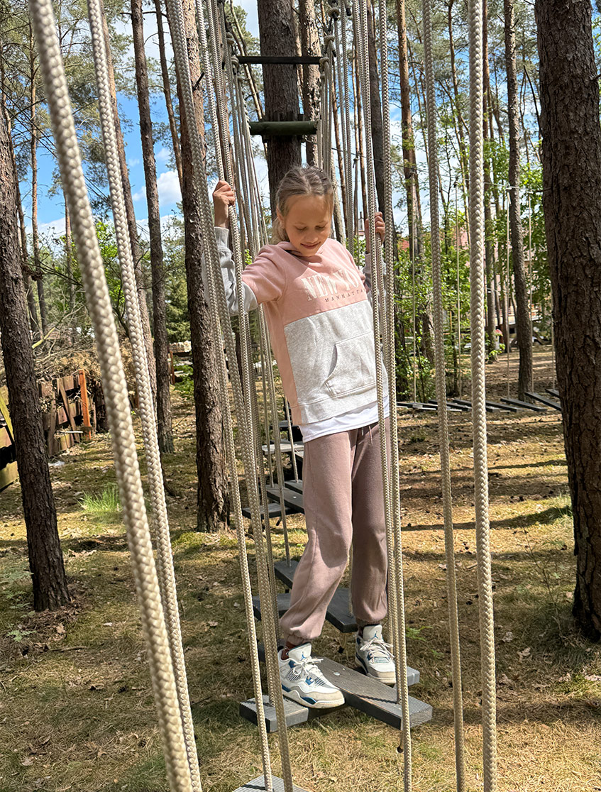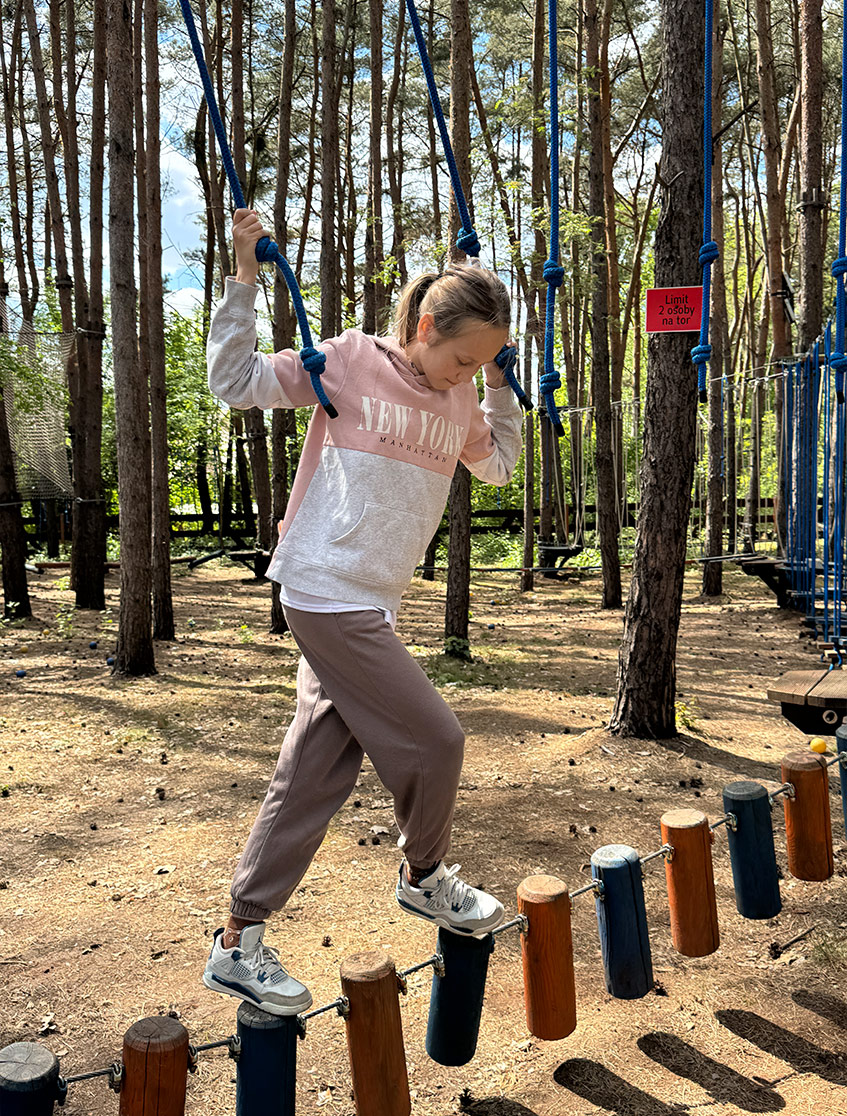 Najłatwiejsza z tras – idealna na pierwsze kroki w świecie parków linowych. Niskie przeszkody, mostki i liny, stworzone z myślą o młodszych dzieciach.